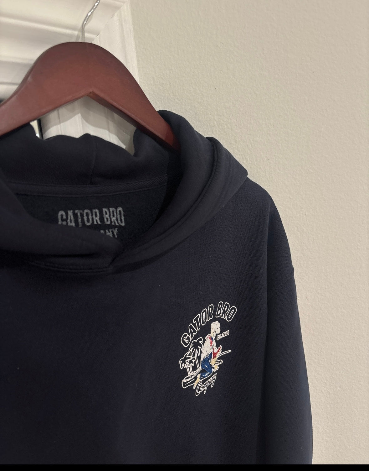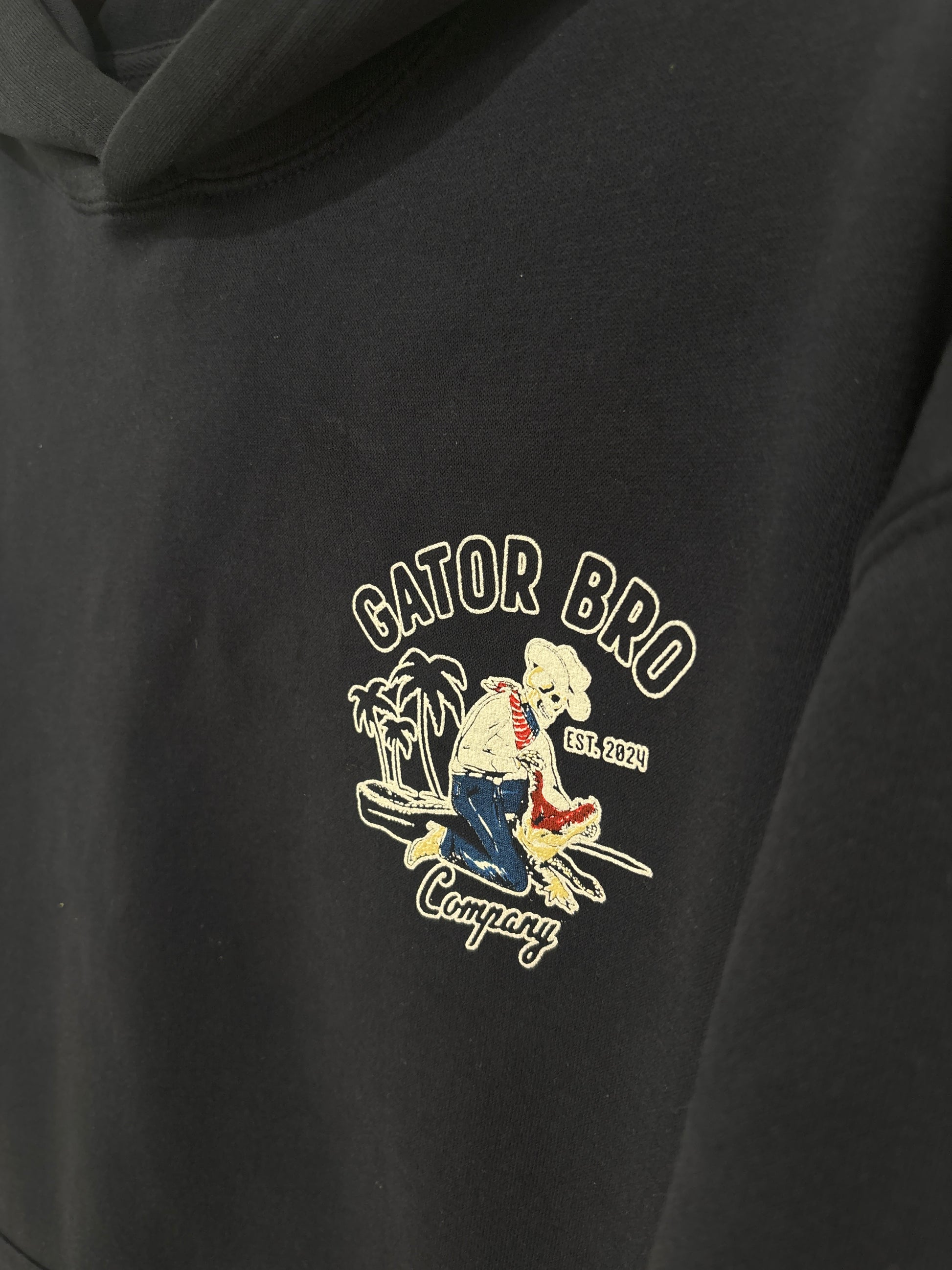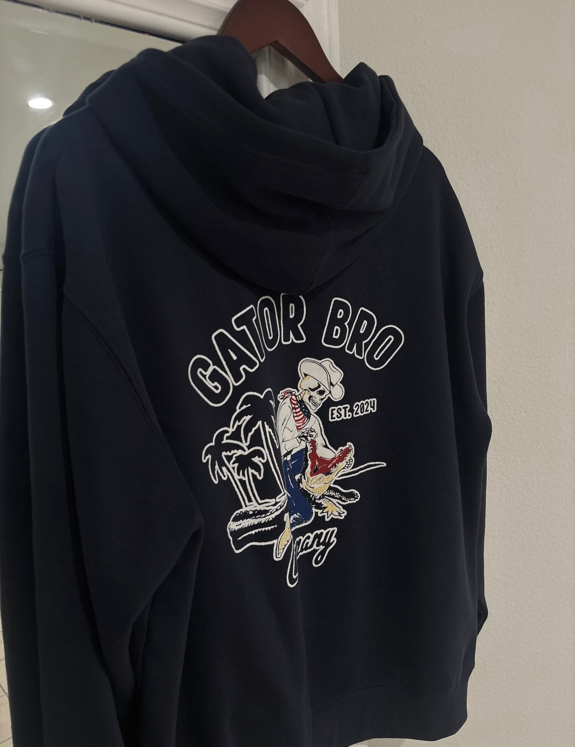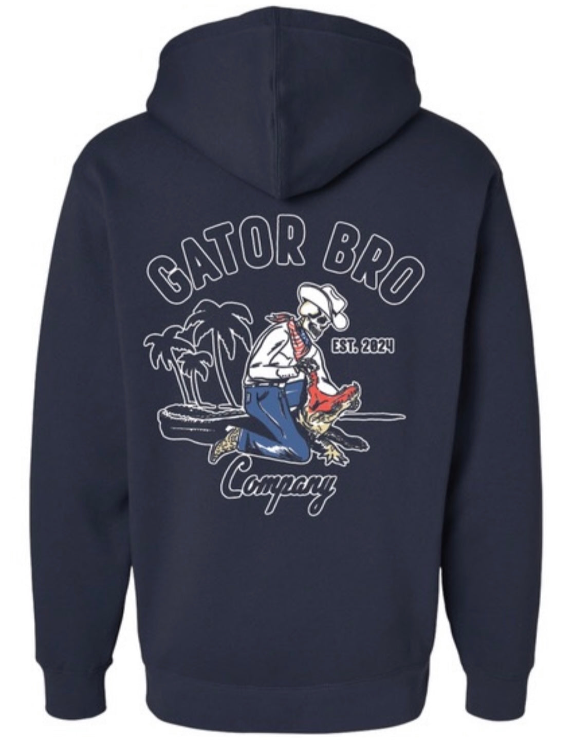 Introducing “The Rugged Coastal” hoodie by Gator Bro Company. This navy blue hoodie features a bold design of a skull cowboy opening an alligator’s jaws, symbolizing toughness and resilience. A subtle print on the front and a striking design on the back make a statement. Embracing our motto, “Gator Tough, Keep Movin’,” it’s built for those who keep pushing forward no matter the challenge. Stay tough. Stay moving.